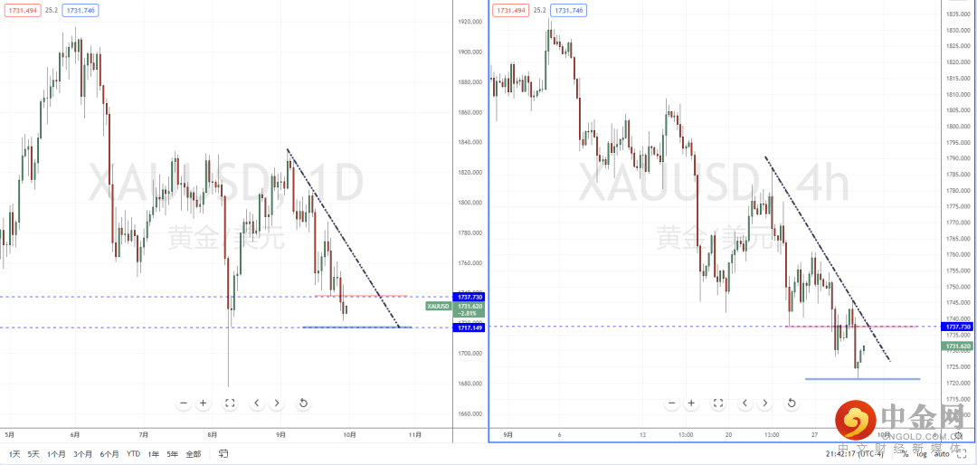 黄金天图:目前整体趋势虽然处于在空头阶段中,上方有下降趋势线的压制作用,以及水平压制带在1737.730附近。但价格也即将触及前期关键支撑作用,短期不宜追空趋势。从日内4小时级别,可适当关注价格回测上方多重压制区域的表现,如果突破上将继续保持反弹节奏。反之,测试受阻承压则可继续尝试空头机会,但需要注意下方空间幅度。
