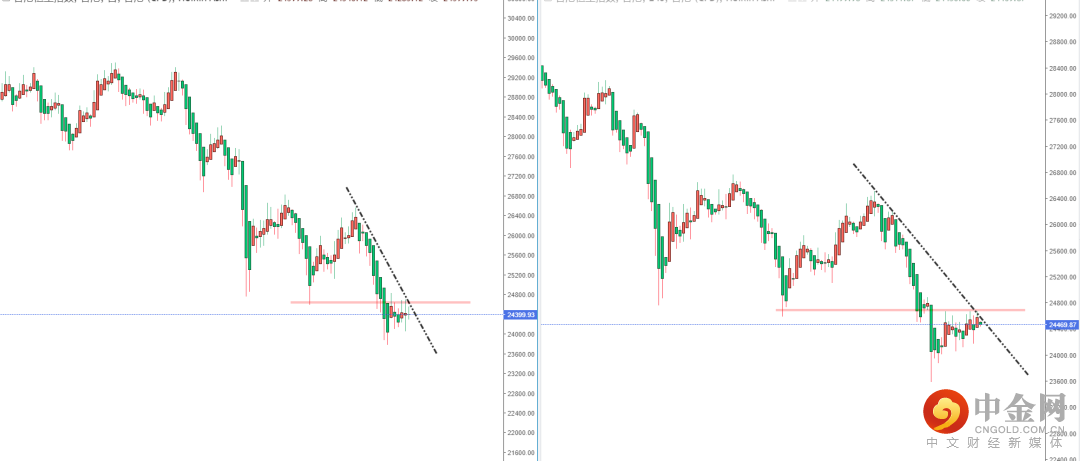 恒生指数天图:目前整体行情依旧在弱势空头阶段中徘徊,上方有下降趋势线的压制作用以及水平压制带在24526.01附近。从日内4小时级别,价格已经触及关键的多重压制节点附近。可适当关注趋势在此区间的收线表现,如果破位将继续保持原空头格局。反之,则反弹上行。