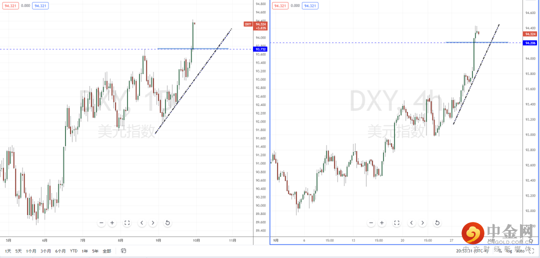 美元指数天图:短期价格坚决上行突破,并且也有效打开上方多头空间。整体格局继续保持多头流向,下方有上升趋势线的支撑作用。从日内4小时级别,由于价格上行幅度较大,不宜追多行情。可适当趋势小幅调整测试水平支撑区域再次向上的多头机会,上方区间目标位置参考周线前期高点附近。