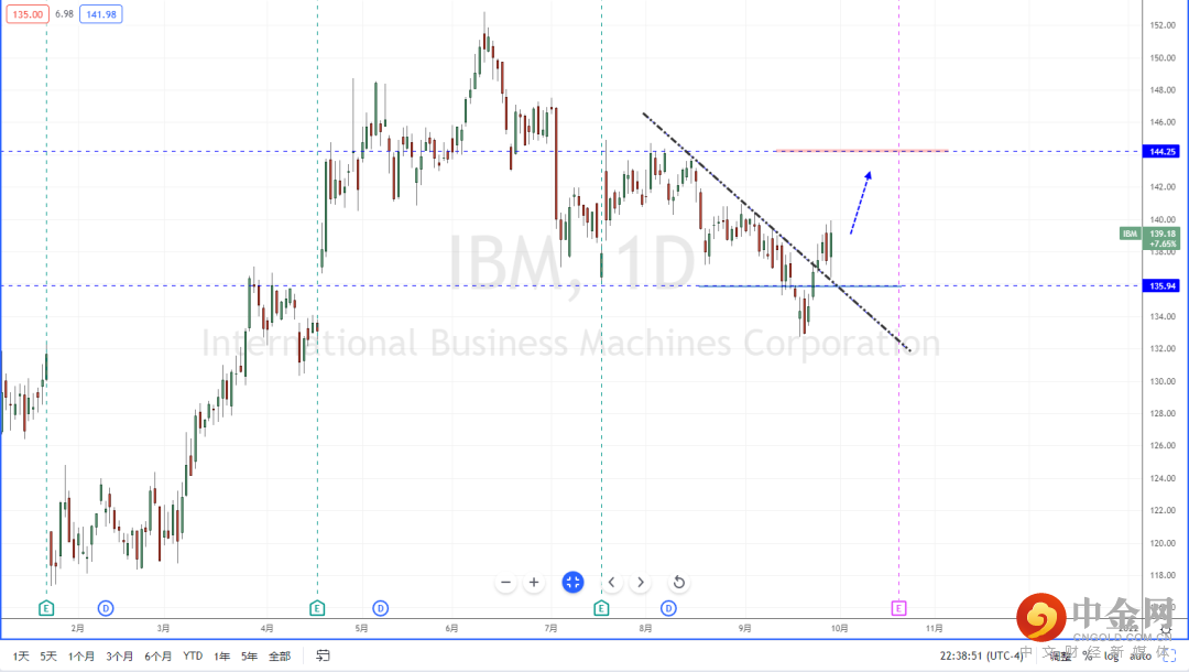 IBM:近期虽然市场受到不利数据的持续影响,导致行情反复无常,各产业之间的分化也逐步加剧。但个别类股趋势相对明朗,从IBM目前趋势表现,在破位后收复失地,并且价格也再次突破下降趋势线的压制作用。整体格局处于多头方向,可适当关注趋势调整后继续上行的多头机会,上方区间目标位置参考144.25一带。