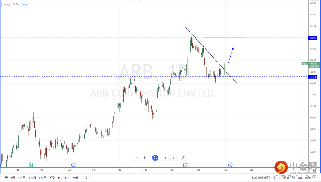 ARB:虽然近期市场持续低迷,大部分产业都处于在弱势阶段中。但ARB目前整体趋势却在关键支撑区域徘徊调整后上行。下方水平支撑带在47.16附近,同时也有效站上下降趋势线的压制作用。可适当关注价格调整后继续上行机会,上方区间目标位置参考53.95附近。