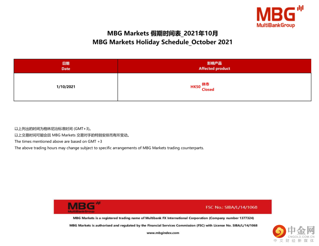 MBG Markets 重要公告丨2021年10月假期时间表