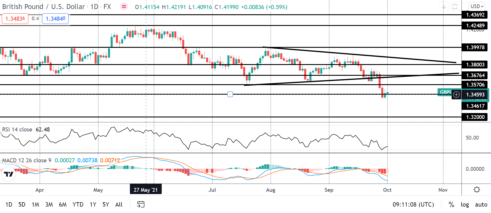 从英镑开始,本周对英镑的压力很大。不断升级的能源危机和影响经济的供应链问题加剧了投资者对英国的不确定性。随着越来越多的加油站空置,能源价格继续上涨,供应商和分销商步履蹒跚,英国首相本周下令军队参与燃料配送,解决了燃料短缺问题。与此同时,政府的休假计划即将结束,全民信贷(失业支持)即将削减,这引发了人们对英国近期经济前景的担忧。