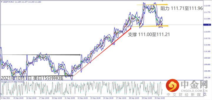 日级别线图,昨日涨多回调修正KD过热,若守在5日均线附近震荡,可能延续涨势;15分钟K线,短线112.00关口承压回落,若守住111.00关口,可能形成区间震荡。