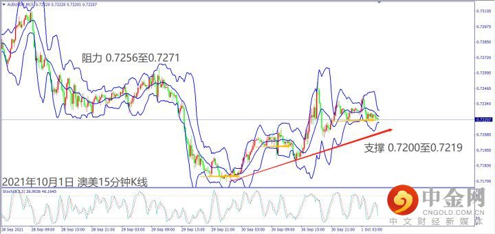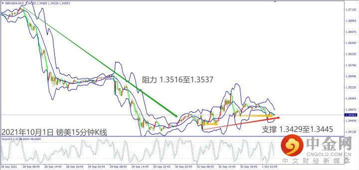日级别线图,上影线阳烛反弹,KD出现金叉,可能上测5日均线;15分钟K线,上涨突破下降趋势线,今天在1.3450附近震荡,短线可能形成盘涨。