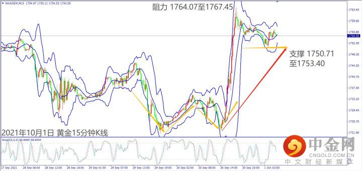 日级别线图,长阳烛收复一周跌势,守住10日均线,可能延续上涨;15分钟K线,出现W底反转,短线在1750美元上方整理,大有可能形成盘涨。