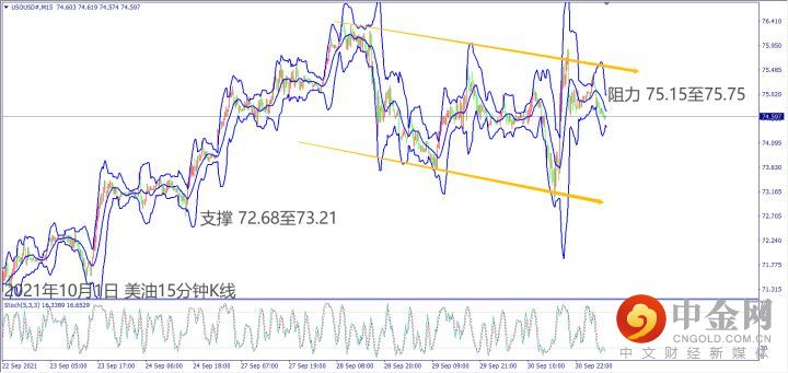 日级别线图,连三天冲高受阻75美元,一旦跌破5日均线,可能转跌;15分钟K线,短线形成下降矩形,趋势线反压冲不过,大有可能下探支撑。