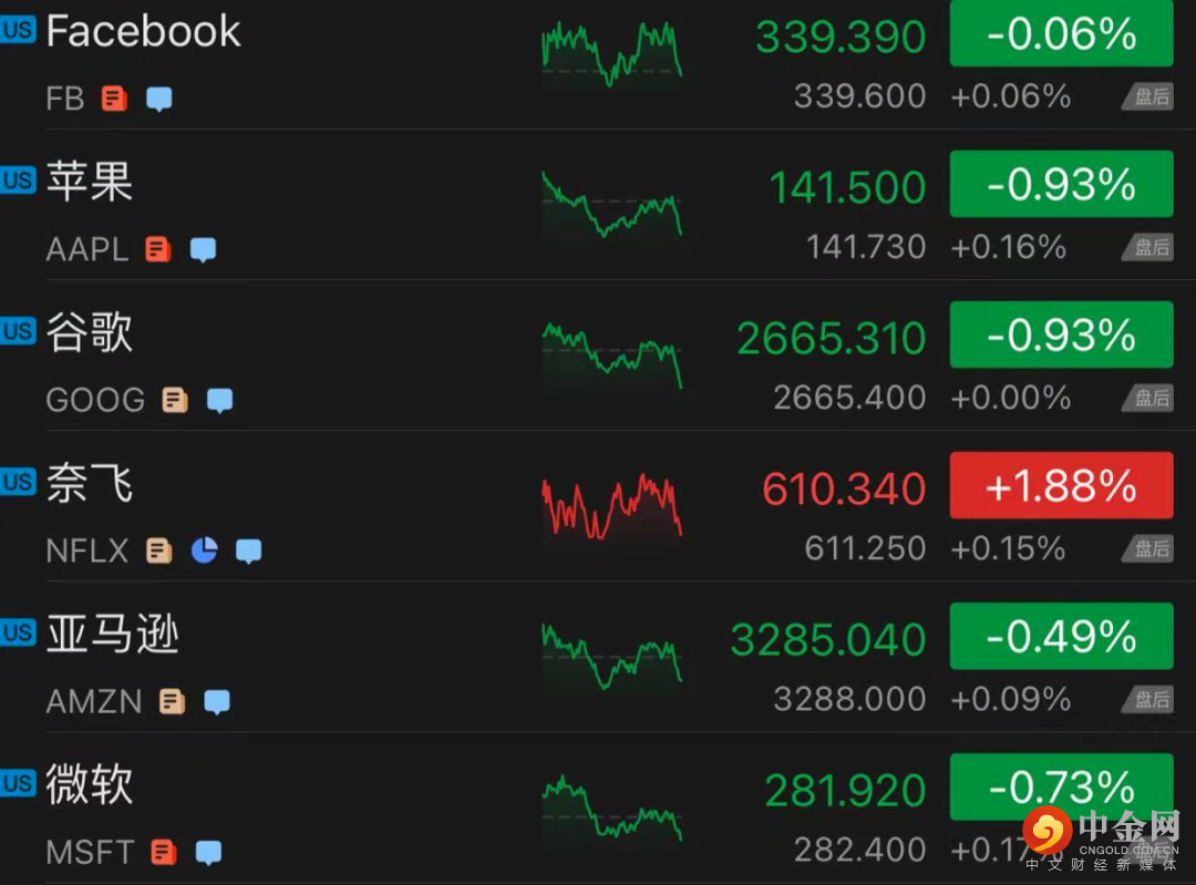 个股方面,大型科技股多数收跌,奈飞涨1.88%,谷歌跌0.93%,苹果跌0.93%,微软跌0.73%,亚马逊跌0.49%,Facebook跌0.06%。