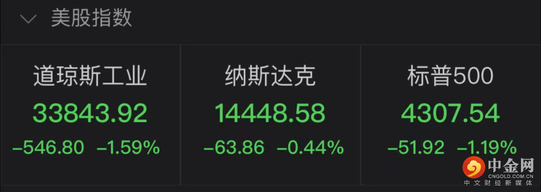 当地时间周四,美股三大股指集体收跌。截至收盘,道琼斯指数收跌546.80点,跌幅1.59%,报33,843.92点,继周二之后本周再度一日跌超500点,报33843.92点,创6月18日以来新低;标普500指数跌1.19%,报4307.54点,回吐周三所有涨幅,创7月19日以来新低;纳斯达克指数连跌五日,收跌0.44%,报14,448.60点,创7月19日以来新低。