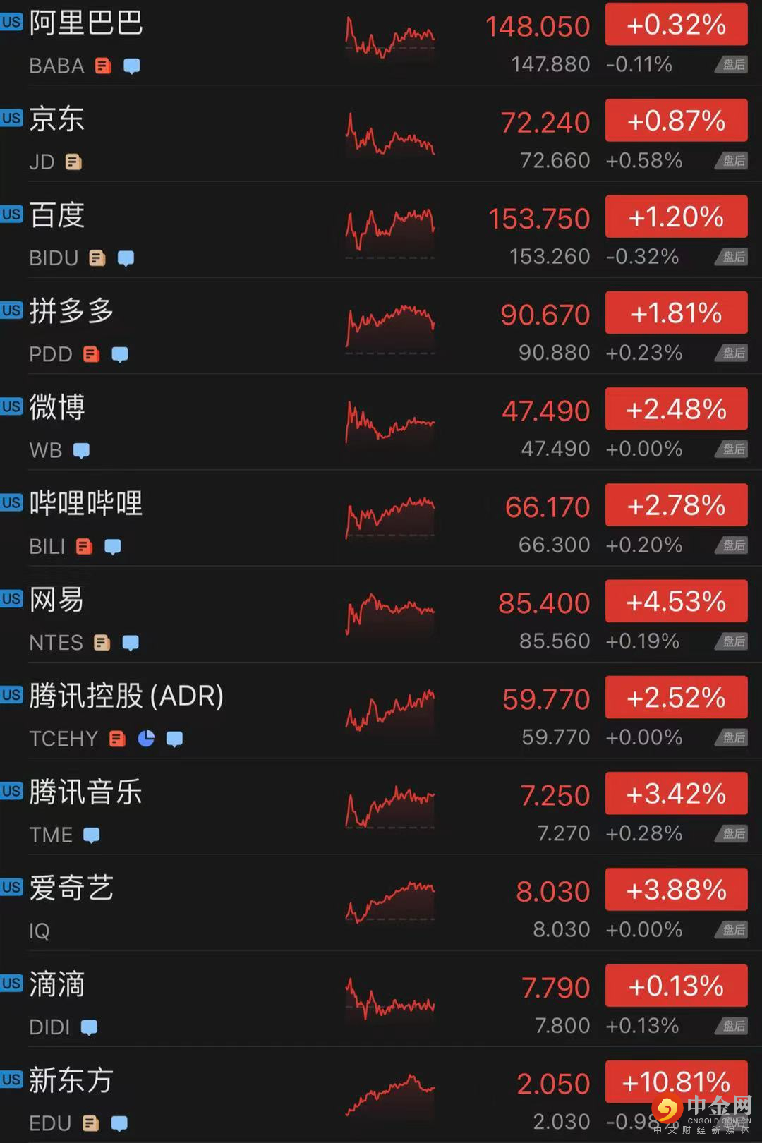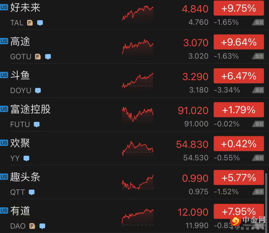 热门中概股集体上涨,阿里巴巴涨0.32%,京东涨0.87%,百度涨1.20%,拼多多涨1.81%,微博涨2.48%,哔哩哔哩涨2.78%,网易涨4.53%,腾讯ADR涨2.52%,腾讯音乐涨3.42%,爱奇艺涨3.88%,滴滴涨0.13%,新东方涨10.81%,好未来涨9.75%,高途涨9.64%。