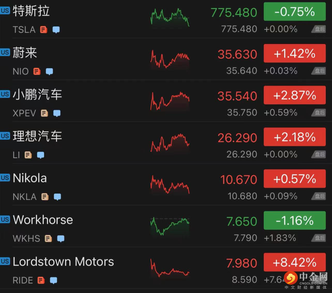 新能源汽车股涨跌各异,特斯拉跌0.75%,蔚来汽车涨1.42%,小鹏汽车涨2.87%,理想汽车涨2.18%,Nikola涨0.57%,Workhorse跌1.16%,Lordstown涨8.42%。
