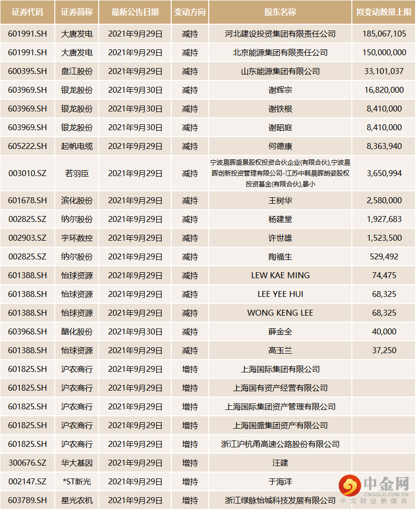 9月29日至10月31日,共计14只个股公布了25条股东拟减持的信息。其中,拟减持个股数量最多的个股是大唐发电(601991.SH),约为1.85亿股,变动数量约占总股本的1%。