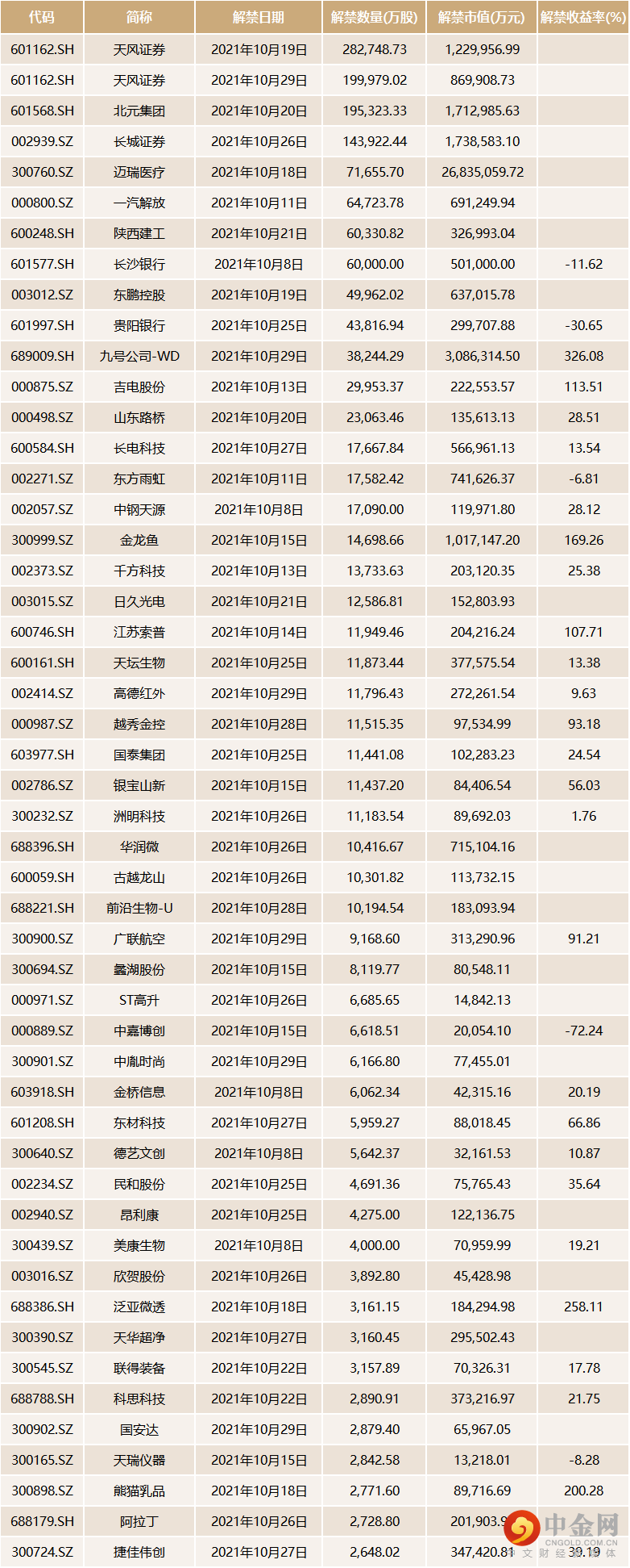 10月份,共计108只个股将迎来限售股解禁。其中,解禁数量最多的为东鹏控股(003012.SZ),为4.99亿股,解禁市值高达63.7亿元,占流通A股比例的12.01%。