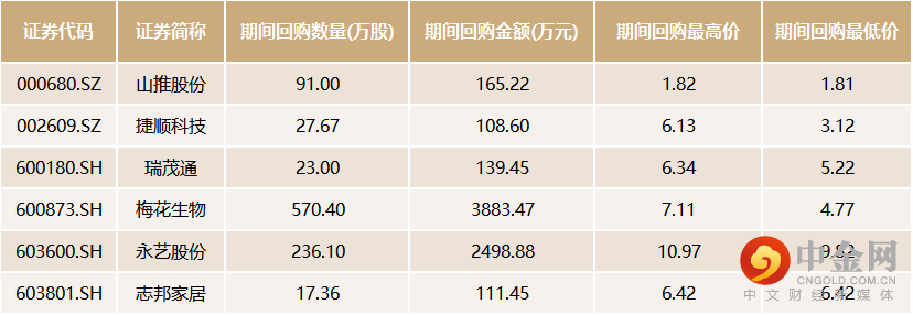 10月份,6只个股进行股票回购。其中,梅花生物(600873.SH)拟回购金额为3883.47万元,永艺股份(603600.SH)拟回购金额为2498.88万元。