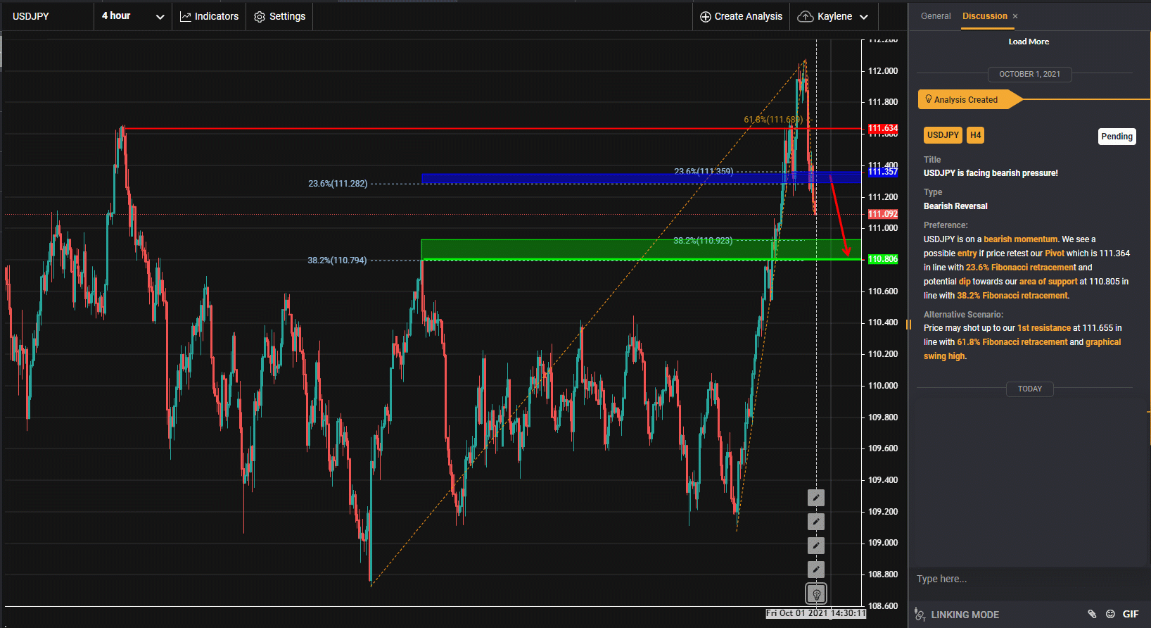 USDJPY 处于看跌势头。如果价格重新测试我们的支点,即111.364,符合23.6%的斐波那契回档位,我们看到一个可能的入口,并可能向110.805的支撑区倾斜,符合38.2%的斐波那契回档位。