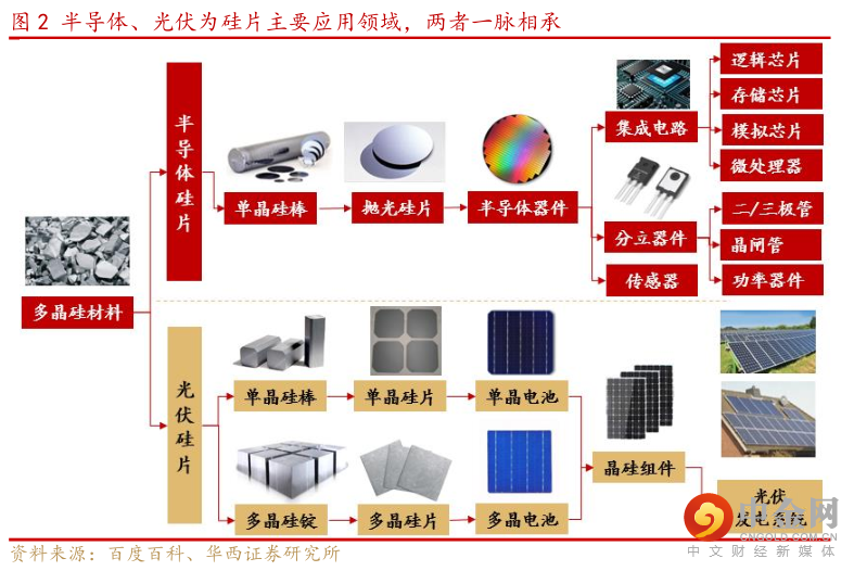 光伏产业链上游原材料与半导体行业相同,都是将多晶硅提纯成单晶硅再制作硅片,区别在于半导体硅片纯度要求99.999999999%以上(11至13个9),光伏硅片纯度只需要99.9999%以上(4至6个9),为了更高的光电转换效率,目前光伏硅片也普遍采用单晶硅路线。