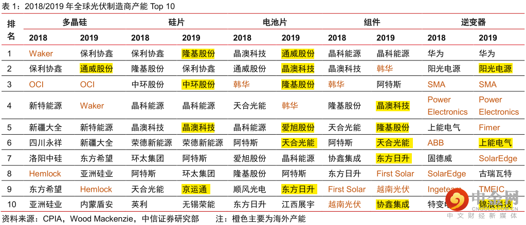 中国光伏产业链在过去15年来凭借成本优势和政策红利,并依托中国大制造业生态的快速规模化推广能力,规模优势和技术水平持续提升,目前年产值超 5000 亿元,占全球7成以上,成为全球光伏制造中心。2019年中国在光伏多晶硅、硅片、电池片、组件、逆变器环节全球产量份额已提升至 67%/97%/79%/71%/59%,且由国内厂商自给的原材料及部件占比达近85%,基本不存在核心原材料和设备环节被海外厂商严重卡脖子的情况,主导全球光伏供给格局。近两年光伏产业链的多晶硅/硅片/电池片/组件/逆变器等主要环节,中国企业在产能 Top 10 制造商中分别占据 7/10/9/7/5 席: