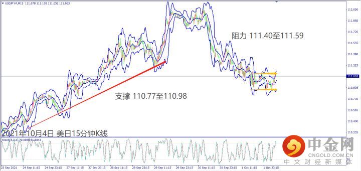日级别线图,回调修正KD过热,守住10日均线,大有可能维持涨势;15分钟K线,高档以盘代跌,一旦突破111.00关口,有机会挑战上方阻力。