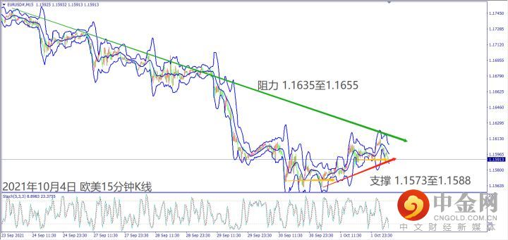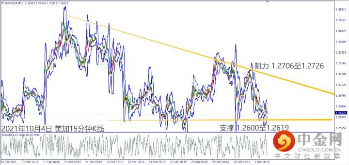 日级别线图,连续两根K线留下影线,KD金叉信号,有机会出现反弹;15分钟K线,短线形成盘涨,一旦突破下降趋势线,大有可能挑战前高阻力。