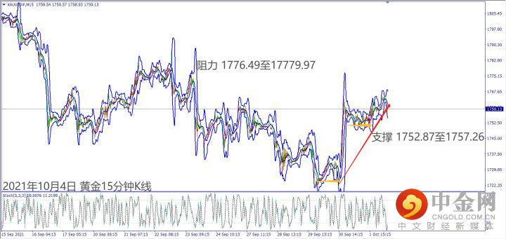 日级别线图,连续上涨重回1760美元,守住10日均线,有机会挑战30日均线;15分钟K线,短线形成盘涨,守住上升趋势线,大有可能挑战上方阻力。