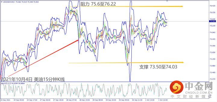 日级别线图,近期在75美元附近震荡整理,若前高不过且跌破5日均线,可能转跌;15分钟K线,短线处于区间震荡,盘整顶部冲不过,大有可能下探支撑。