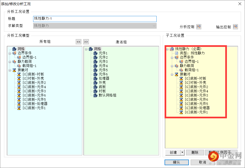 ③分析工况窗口中,边界,载荷,接触条件没有赋予完整。