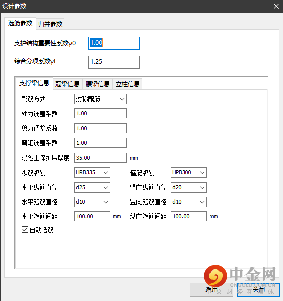 执行配筋设置后点击设计按钮,软件可自动生成配筋信息或者钢构件的验算信息。其中混凝土内支撑进行配筋条件设置时,可以根据情况进行不同构件位置处的归并数值,其中0为不归并,1为全归并,可得到各个构件位置处的具体配筋结果。钢构件无配筋信息,可以根据公式验算强度是否满足要求,具体如图21~23所示。
