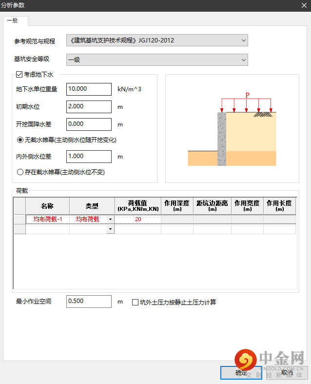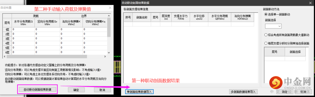 内支撑分析所需要的边界条件可以通过两种方式进行实现,第一种为计算剖面所得结果文件夹内自动生成内支撑分析的边界条件,可以直接进行导入;第二种为手动输入荷载以及弹簧刚度数值,具体如图19所示。