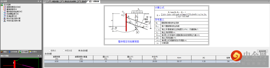进行断面的分析时将选定好的断面设定对应的规范以及荷载、水位等条件后进行弹性支点法的计算,得到对应的土压力以及验算公式等结果,如图13~15所示。
