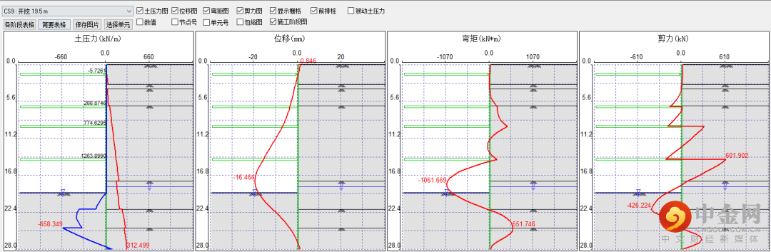 实际项目中需要进行楼板施工,并且需要对既有支撑进行拆撑操作,软件不可自动生成楼板,需要手动进行添加,只需设置深度即可,不用设置其他参数。在一般施工阶段定义中根据激活跟钝化的规律,将后续拆撑以及施加楼板的阶段进行自定义生成后,可以进行分析设计,得到上图14~15的结果,点击生成计算书的按钮即可自动生成计算书。