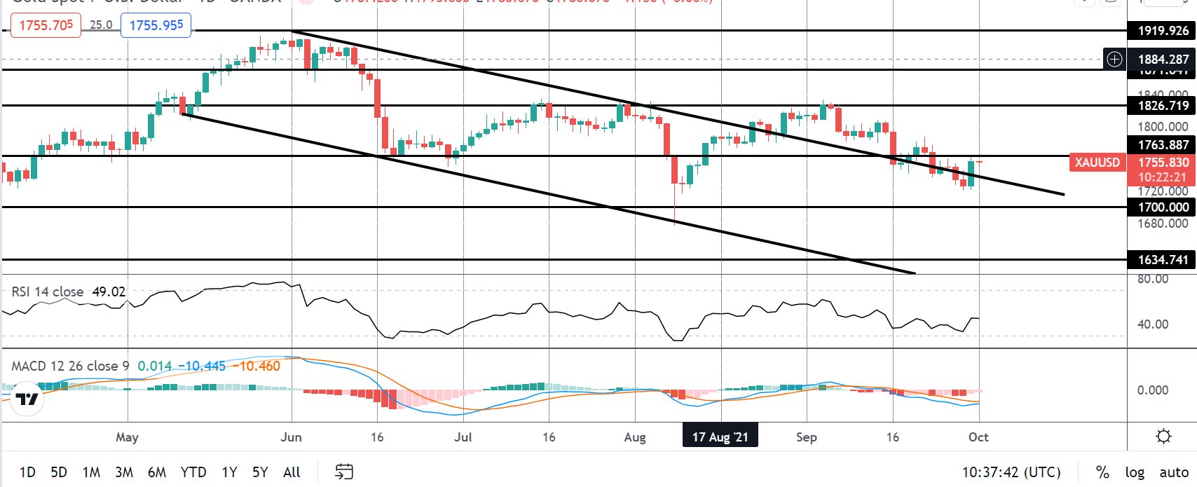 最近黄金价格下跌,导致市场交易回落,以重新测试破裂的熊市通道顶部。价格随后出现了小幅反弹。不过,1763.88点的水平目前仍为阻力位。由于指标仍然看跌,市场关注的焦点是在低于水平的情况下继续下跌。然而,回到上面,下一步有上升到1826.71的空间。