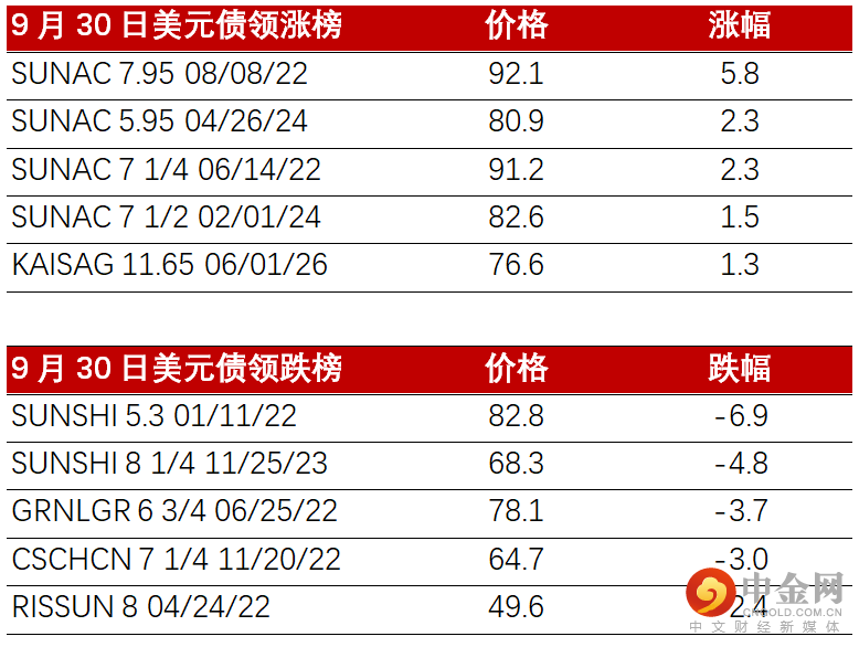 上周四(9月30日),因临近十一假期,中国高收益债券市场市场整体交投较少。受央行、银保监会要求金融机构协助地方政府稳定房地产市场消息影响,地产债券市场情绪略有回稳,部分账户抄底买入。融创继上周初的波动后有所走强,前端债券有较好购买需求。其他债券如佳兆业/中梁/时代等在小规模买盘推动下反弹约0.5pt,而较高评级债券如碧桂园/世茂交投相较活跃,上涨约0.25-0.5pt。