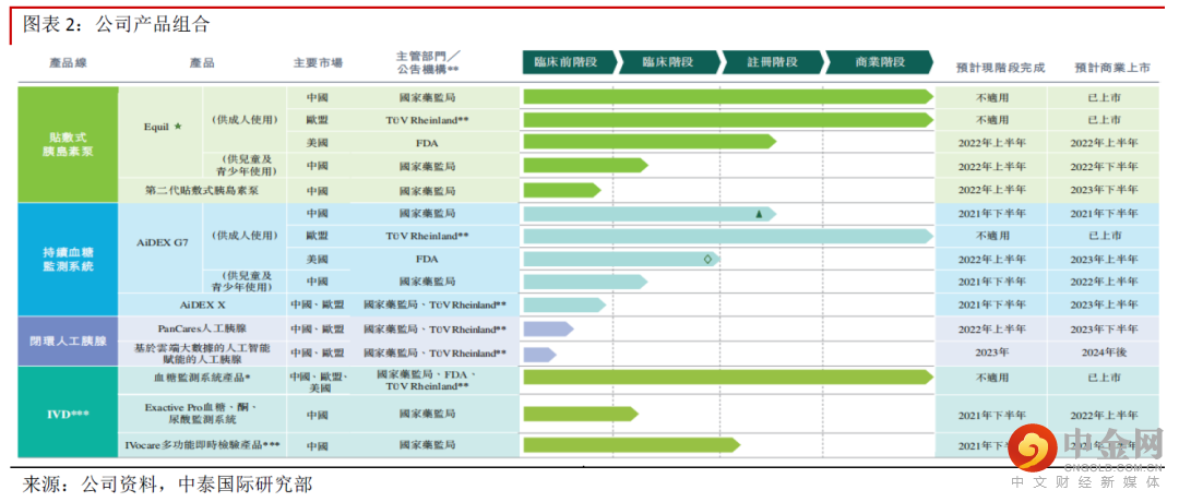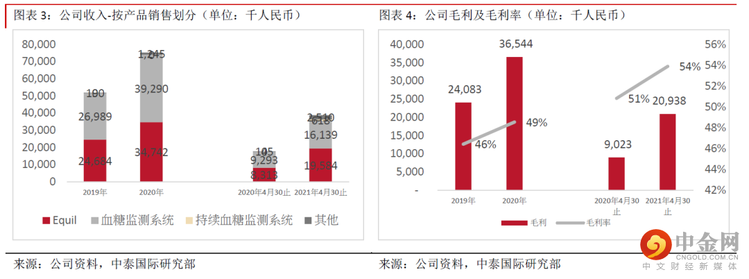 财务分析:公司往绩期间的全部收入来自医疗器械的销售。尽管已有3款产品(包括Equil、血糖监测系统、持续血糖监测系统)完成商业化并上市销售,但目前公司依然亏损。通过财务数据可以看出公司的营收增长迅速,核心产品Equil的毛利率相对较高, 但随着销售的增加公司研发开支、销售分销开支及行政开支也相应大幅增加,造成公司的持续亏损。2019-2020年,及2021年首4个月的,公司的总收入分别为人民币5,186万、7,528万、3,885万元,其中Equil 及血糖监测系统的销售分别各占比一半;公司的整体毛利率分别为46.4%、48.5%、53.9%, 其中Equil的毛利率为71.8%、72.5%、 78.5%, 血糖监测系统的毛利率为23.4%、27.4%、20.6%;销售及分销开支分别为2,700万、5,506万、1,461万元;行政开支分别为3,362万、4,576万、5,96万;研发开支分别为5,006万、8,201万、9,03万元;归母净亏损分别为7,862万、1.2亿、258万元,期末现金及现金等价物分别为4,143万、5.4亿、6.3亿元。