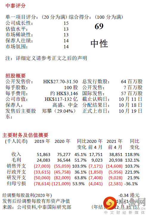申购建议:目前公司正在增强商业化能力,截至2021年4月底,销售网络覆盖中国30个省、直辖市和自治区的销售,并将产品销售扩大至海外市场。此外核心产品Equil已在中国销售或分销至787家医院,未来预计随着核心产品的销售增长,亏损有望快速收窄。但是考虑近期新股市场对于没有盈利公司反映较为冷淡,尤其医疗器械类的新股堃博医疗(2216 HK)、先瑞达(6669 HK)、心玮医疗(6609 HK)均首日破发,综上所述给予其69分,评级为“中性”,建议投资者在上市后持续关注。