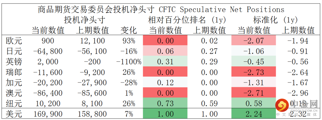 CFTC资金流数据显示,澳元、瑞郎空头处于极值,因此,预计短期随着资金流入并支持其回涨,另外,美元多头也处于极值。