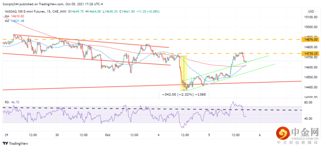 看起来纳斯达克指数期货仍存在熊旗形态的可能,不过低点吸引了逢低买入的买方入场。