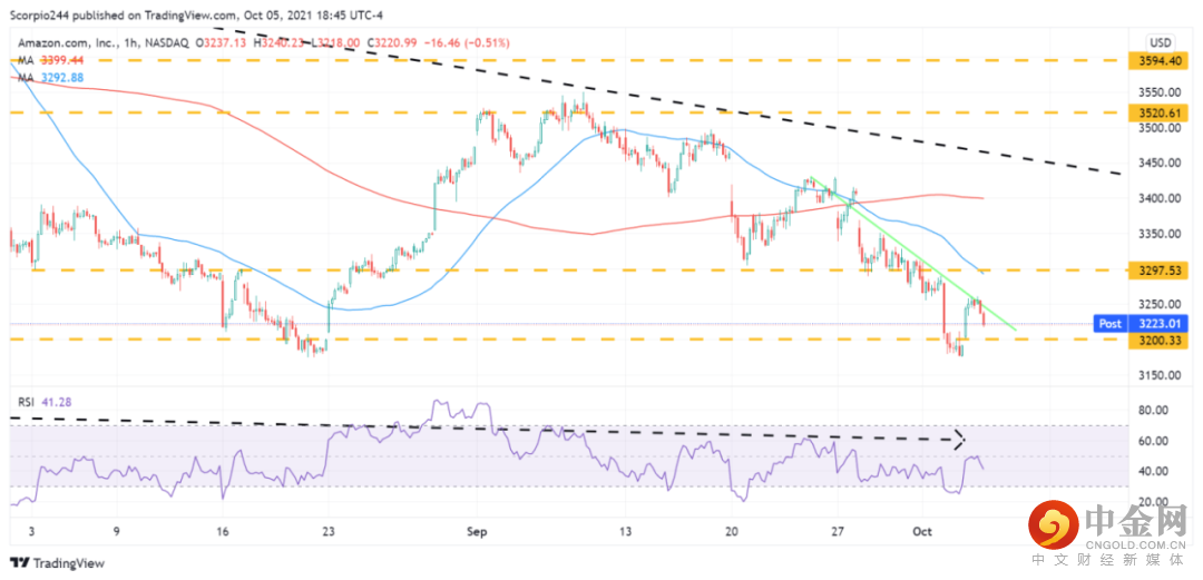 亚马逊的图形中看起来有一个明显的下降趋势线,3200美元处的支撑线是重要的点位。