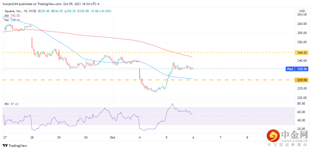 Square公司今天巨幅反弹,大涨逾4%。不过这一走势看起来仅是填补了昨日的缺口,并且重返之前下滑趋势线处。