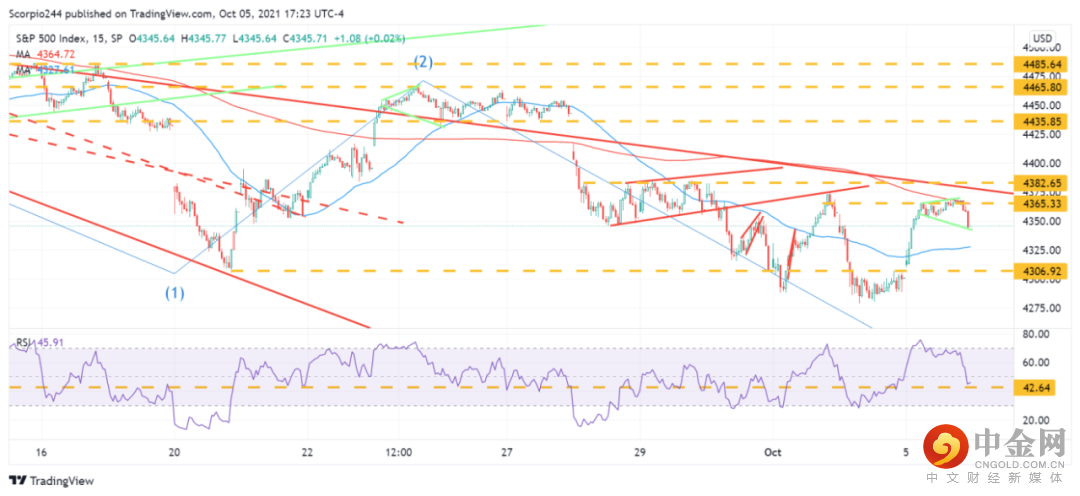 标普500指数今天的走势看起来与9月23日的走势非常类似(图中标识2处),有着同样的高点缺口、正在扩大的楔形形态。这意味着标普500指数将大幅回落至4300点。