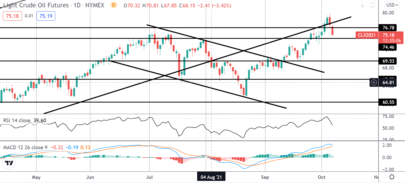 在短暂突破上升通道低点后,油价已经逆转,目前交易价格已回到2021年初始高点76.78附近。随着MACD和RSI指数大幅下挫,在74.46点下方的一段时间内,这一走势有空间加快步伐,使69.53点成为焦点。然而,尽管74.46仍然有效,但焦点在于短期内的进一步上涨。