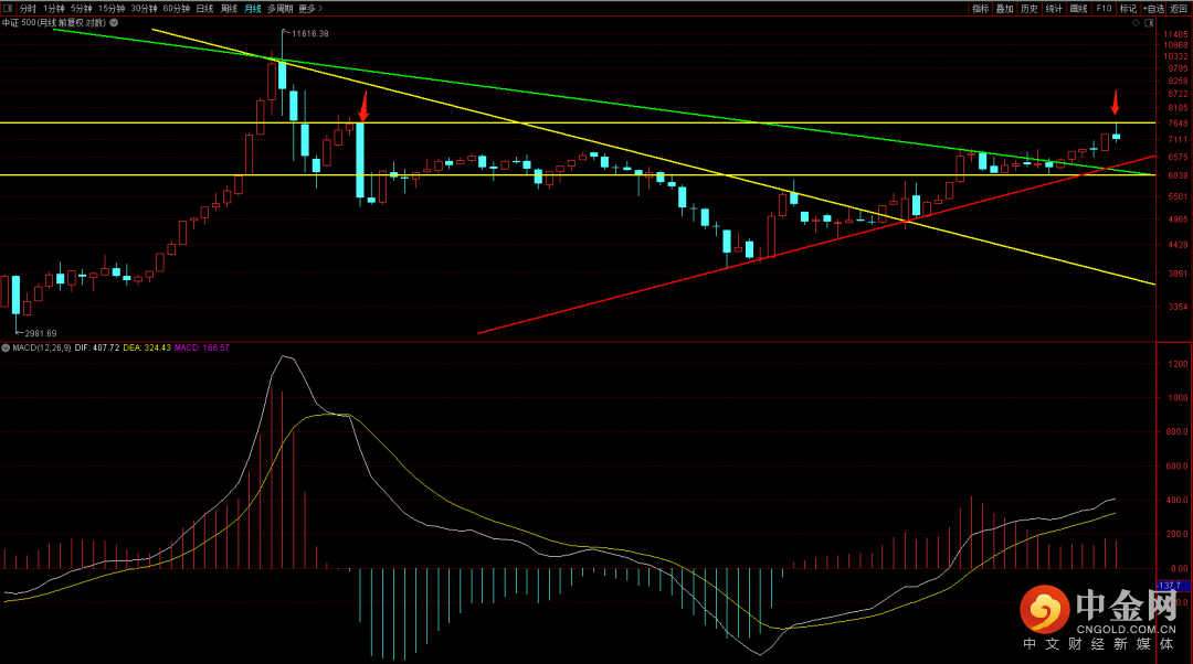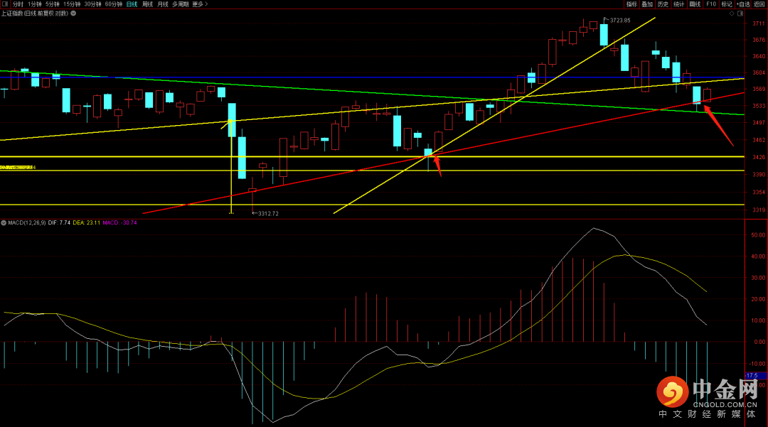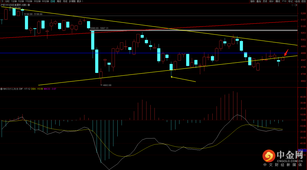 沪深300收盘刚好卡在上升趋势线之上,短期macd由之前的扩张出现了再次收缩的走势,关注后续行情如果再次出现扩张的话且确认跌破上升趋势线,大概率会出现去挑战新低的可能性。
