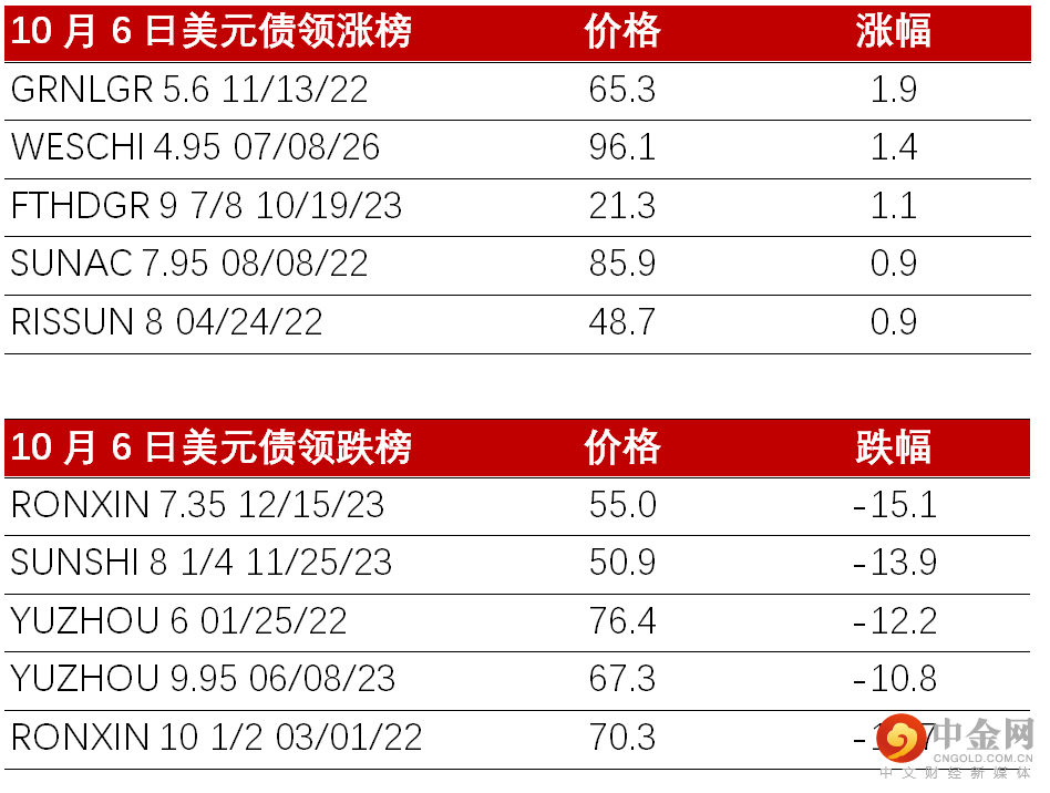 昨日(10月6日)中国高收益债券市场持续动荡情绪。市场流动性低,加上私行普遍降低地产债券贷款价值比(LTV),债券价格大幅走低。佳兆业下跌约4pts,建业下跌约3-5pts,禹洲/融信/阳光城下跌约5-10pts。早盘仅部分前端债券如旭辉/世茂等有见买盘,但之后仍逐渐消退。评级较好债券如碧桂园/龙光相较稳定。工业板块,易居下跌约5-10pts,西部水泥26年到期债券上涨约1.5pt至96水平。部分地产公司持续回购债券,禹洲回购1000万美元22年1月到期债券,建业9月共回购1392万美元23及24年到期债券,金辉继前天公告回购5670万美元债券后昨天再回购1820万美元22年到期债券,弘阳昨日回购300万美元21年到期债券。
