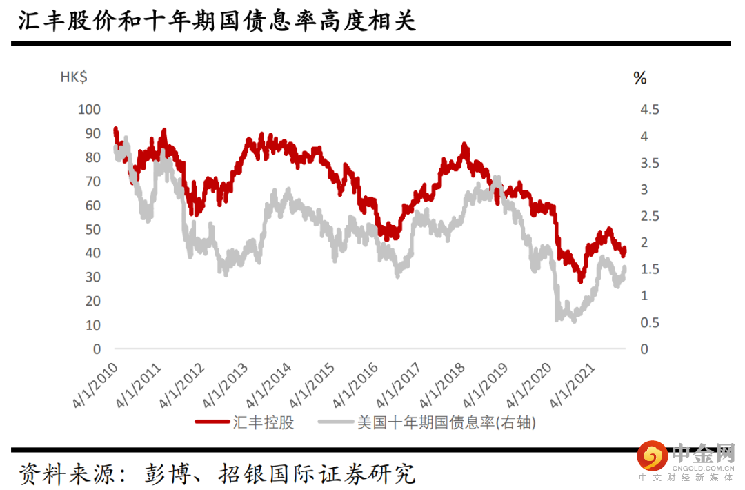 汇丰控股(5 HK)受惠美债息上升 - 近日美国十年期国债息率低位回升, 有利大型银行息差扩阔, 历史上汇丰股价与美债息率走势高度相关(过去10年相关度0.77) , 持续上升的美债息率对汇丰带来潜在利好。