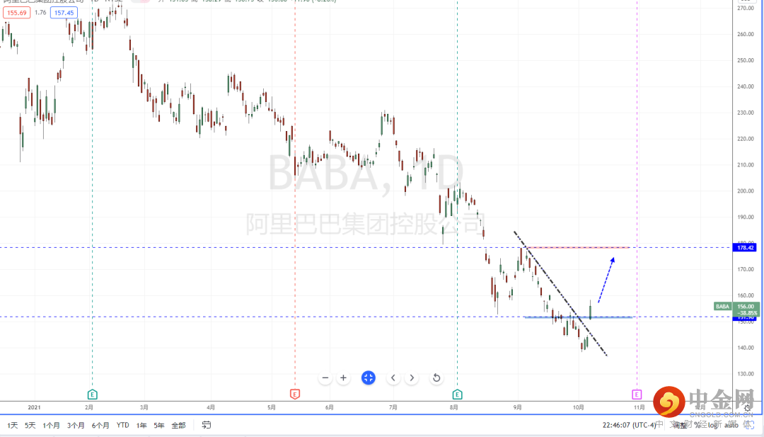 BABA:在短期市场得以缓解之后,目前趋势在持续下行后止转势为上。并且价格跳空上行,有效突破下降趋势线的压制作用,同时也一举站上前期压制带151.73附近。现阶段整体格局处于多头转势初期,可适当关注价格调整后继续向上的多头机会,其目标位置参考178.42一带。