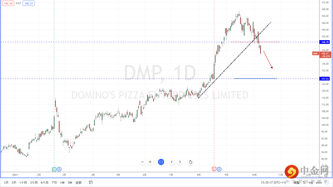 DMP:虽然近期市场不利局面稍有改善,ETF产业也在弱势阶段有拐头上行迹象,但由于产业之间分化依然存在。对处于相对高位的个股也有明显走弱,从DMP目前趋势在前期形成头部状态后持续走弱,并且在跌破上升趋势线后,再次跌破水平支撑带148.78附近加速下行。现阶段空头格局明朗,可适当关注价格调整后继续向下的空头机会,下方目标位置参考127.23附近。