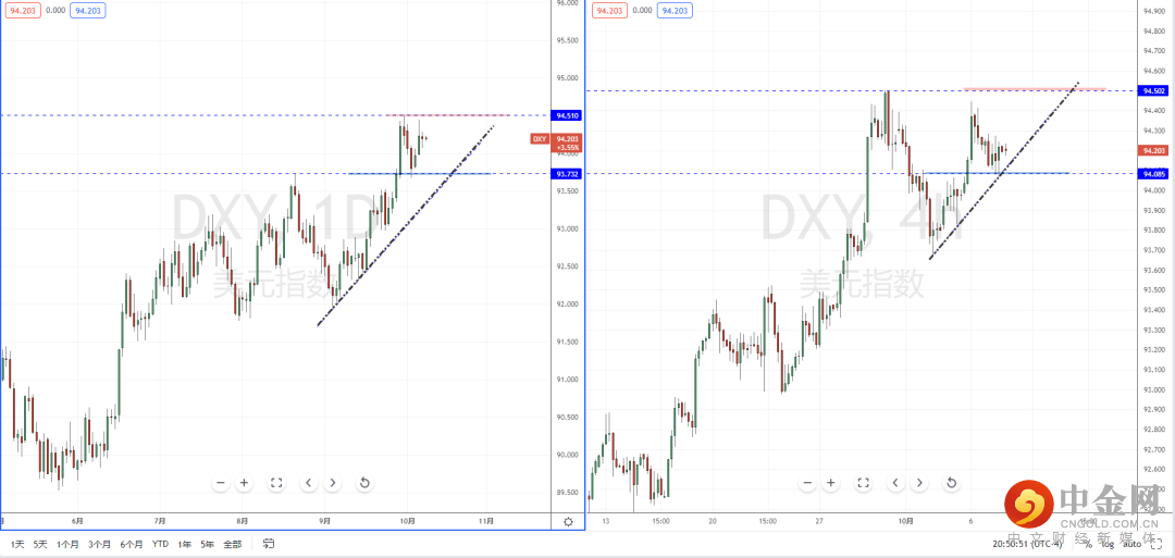 美元指数天图:目前趋势在打开上方多头空间后继续进入调整阶段中,但整体格局依然处于在多头流向。下方有上升趋势线的支撑作用,其水平支撑带在93.732附近。从日内4小时级别,价格也正处于测试多重支撑区域表现。可关注晚间非农数据对于趋势影响的变化。如果利好,将可能继续上行冲击,上方目标位置参考94.502附近。