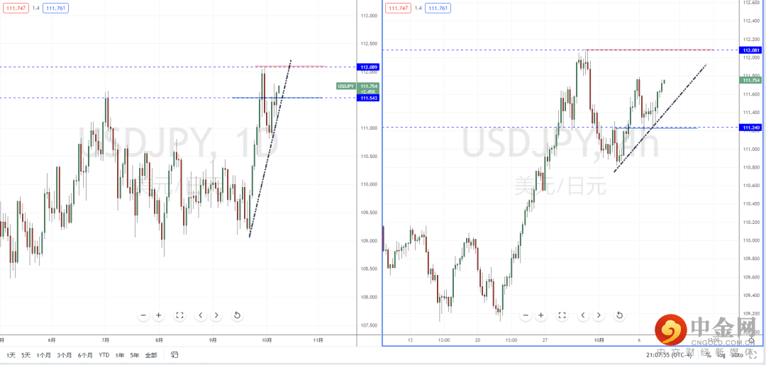 美日天图:短期价格在相对高位区间调整回测后继续起稳,下方有上升趋势线的支撑作用,其水平支撑带在111.543附近。从日内4小时级别,价格也在测试多重支撑区域附近起稳上行。可适当关注价格短期调整后继续上行的多头机会,上方目标位置参考112.089附近。