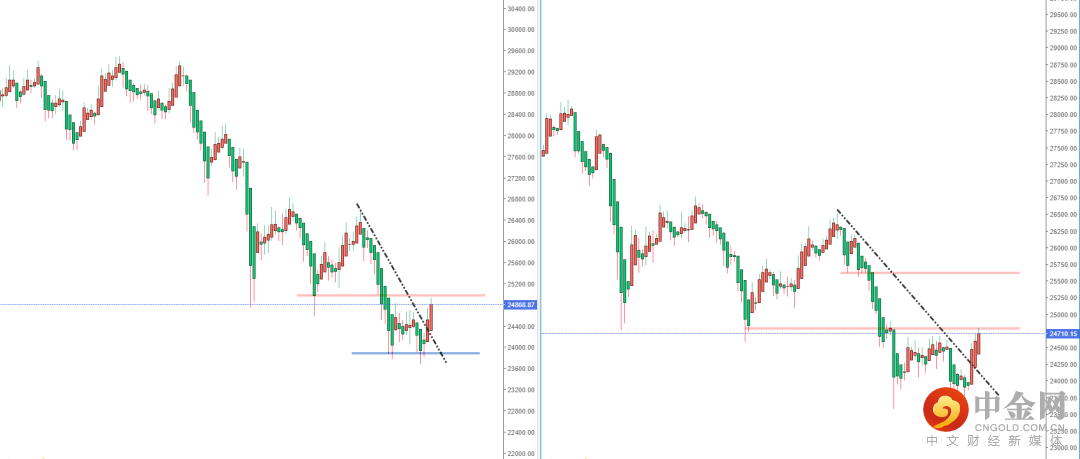 恒生指数天图:短期价格在相对底部区间纠结止跌上行反弹,并且其趋势也坚决有效突破下降趋势线的压制作用。现阶段行情趋于偏多,从日内4小时级别,价格在有效冲击后,触及前期关键压制区域。可适当关注价格调整后上行突破机会,上方区间目标位置参考25351.28一带。