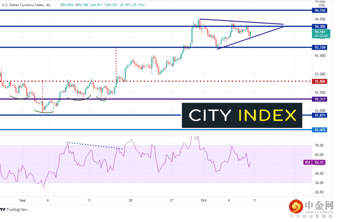 10月迄今,美元指数(DXY)一直在93.68和94.50之间盘整9月涨幅。今天,由于经济数据信号喜忧参半,美元指数目前几无变化。240分钟图上,美元指数一直徘徊于2020年11月以来高点附近。若市场仍预计美联储将在11月会上宣布缩表,美元指数或继续冲高(股市同时推低)。阻力位在9月30日高点94.50附近,然后是2020年9月高点94.72。支撑位在今天低点下方,对称三角形上斜趋势线93.74处,然后是前倒头肩颈线92.80。