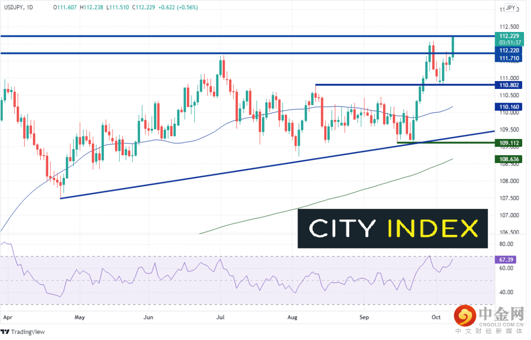 美元/日元通常与10年期美债收益率呈同向走势。今天非农就业数据发布后,收益率开始走高,美元/日元也随之上扬。目前两者相关系数非常之高,达+0.97。随着10年期美债收益率今天突破1.6%(缩表担忧引发债券抛售),美元/日元已升穿112.00,并正测试2020年2月以来高点112.22。7月2日高点至8月4日低点下行之127.2%扩展位在112.16,161.8%扩展位在113.47。然而,请注意RSI正与价格构筑背离,表明美元/日元或做好回调准备。支撑位在7月2日高点111.65附近,然后是8月11日高点110.80。